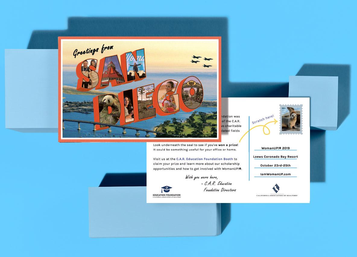 C.A.R. kept their vintage postcard theme going by using a postage stamp as their full color scratch off. They drove more traffic to their booth and helped promote their scholarship opportunities.